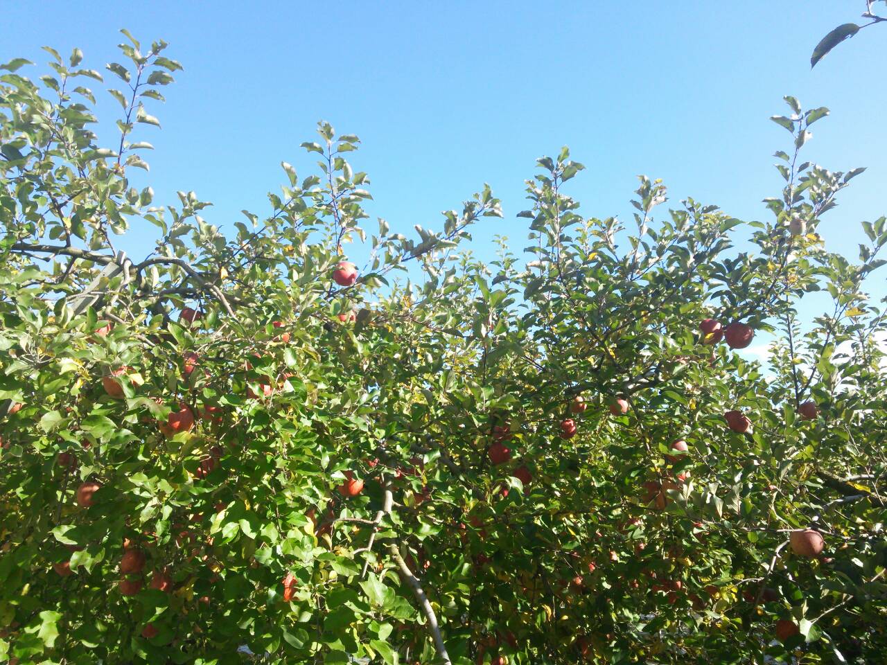 隣のリンゴ達も真っ赤になり、朝晩の寒さで蜜がグッと美味しくなっているんでしょうね。リンゴと空の色がとてもきれいです。