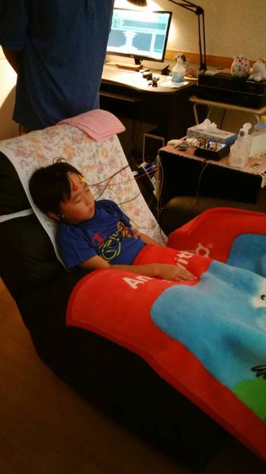 センサーを取り付けている間にバックで流れる音で、すでに眠る体勢になっています。