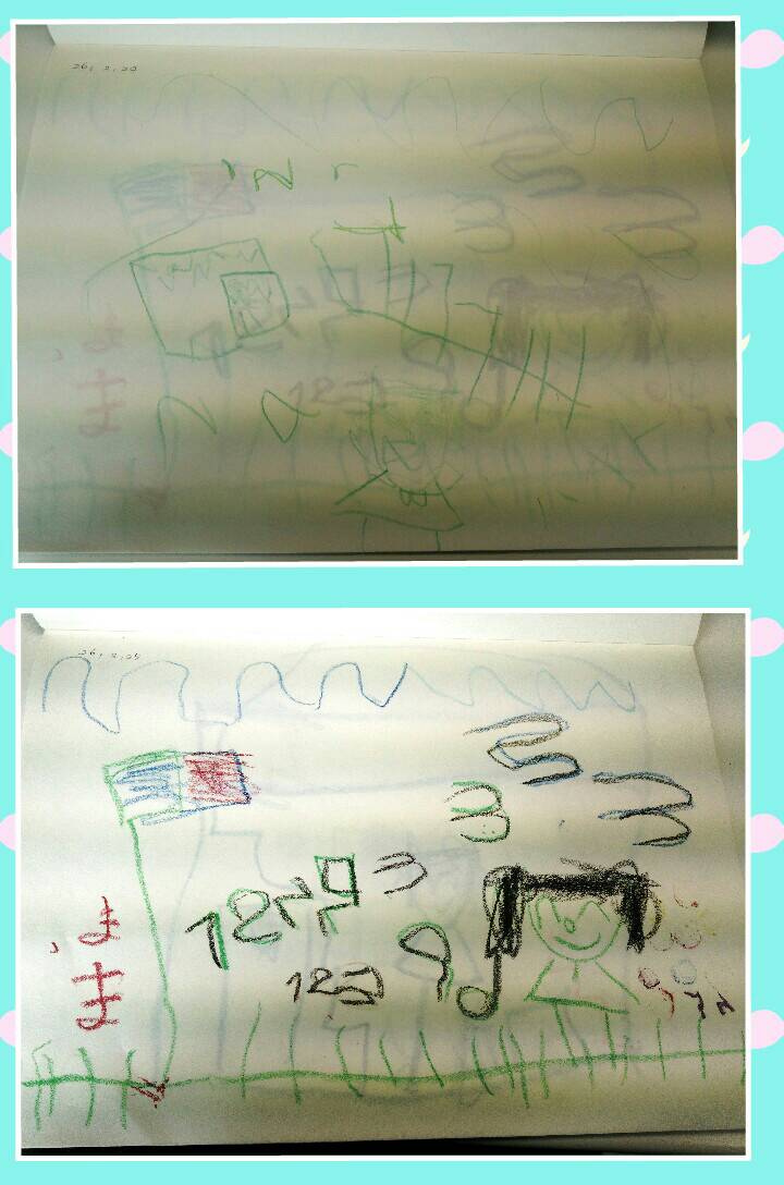 上の写真は、二日目に、おばけを書いたんですが裏の絵が写ってしまいましたね。わかりにくくなり申し訳ございません。すみませんでした。